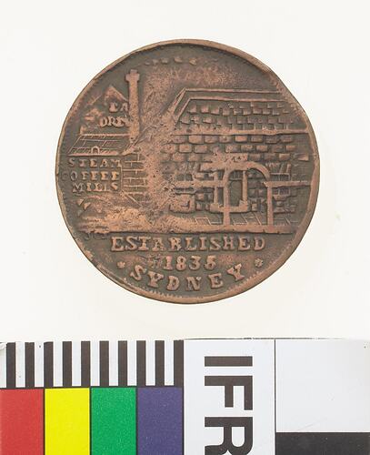 A round copper token (29 mm diameter). The token design featuring the business and foundation date of the issuer: Tea Stores Steam Coffee Mill. It features a view of teas store and shop; on building at left background in five lines; TEA / STORE / STEAM / COFFEE / MILLS in exergue, ESTABLISHED / 1835 / SYDNEY. On the reverse is Britannia seated facing right wearing Corinthian helmet and holding a trident in her left hand, shield with Union Jack resting behind. Above, BRITANNIA; in exergue, 1852 and, in small letters below shield, JCT.