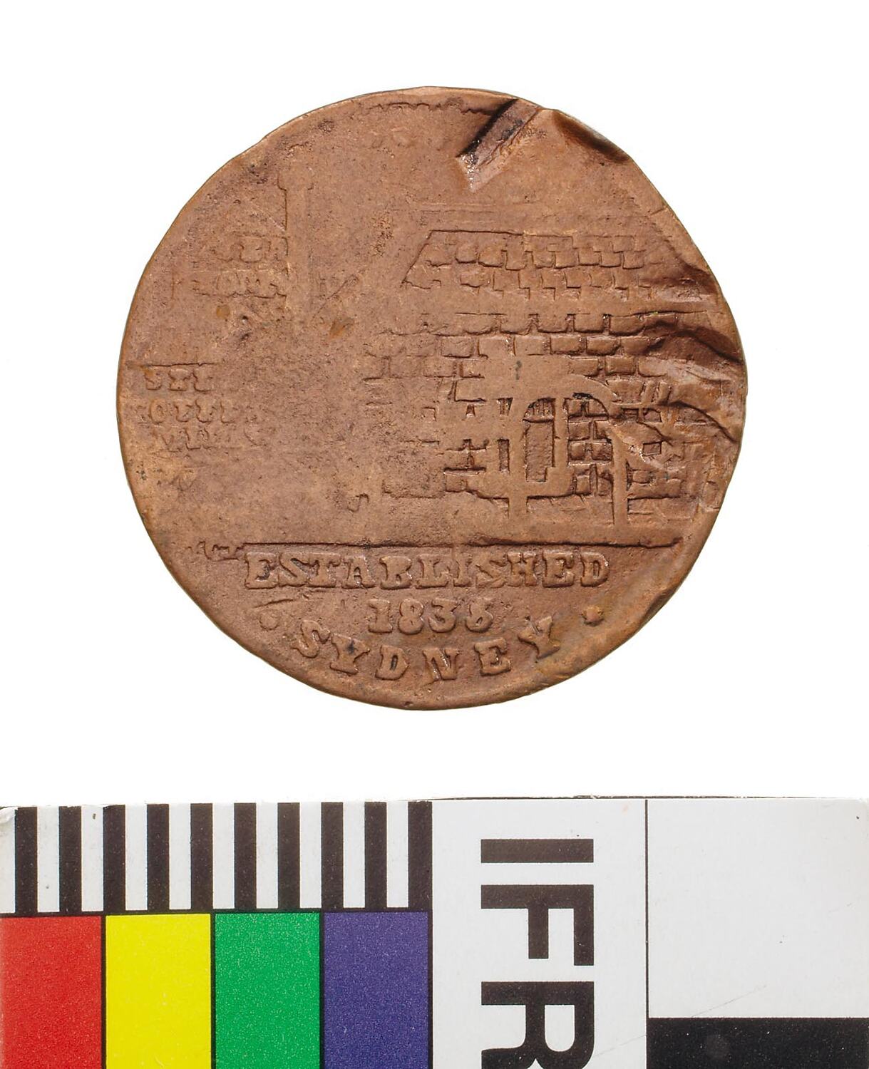 A round copper token (29 mm diameter). The token design featuring the business and foundation date of the issuer: Tea Stores Steam Coffee Mill. It features a view of teas store and shop; on building at left background in five lines; TEA / STORE / STEAM / COFFEE / MILLS in exergue, ESTABLISHED / 1835 / SYDNEY. The side wall of the building has had a second series of 'bricks' added suggesting perspective - difficult to see due to wear on this example. On the reverse is Britannia seated facing right wearing Corinthian helmet and holding a trident in her left hand, shield with Union Jack resting behind. Above, BRITANNIA; in exergue, 1852 and, in small letters below shield, JCT. The token has been cleaned and varnished and is damaged by a series of heavy knocks.