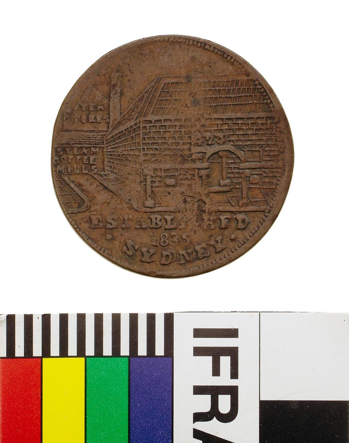 A round copper token (29 mm diameter). The token design featuring the business and foundation date of the issuer: Tea Stores Steam Coffee Mill. It features a view of teas store and shop; on building at left background in five lines; TEA / STORE / STEAM / COFFEE / MILLS in exergue, ESTABLISHED / 1835 / SYDNEY. On the reverse is Britannia seated facing right wearing Corinthian helmet and holding a trident in her left hand, shield with Union Jack resting behind. Above, BRITANNIA; in exergue, 1852 and, in small letters below shield, JCT.