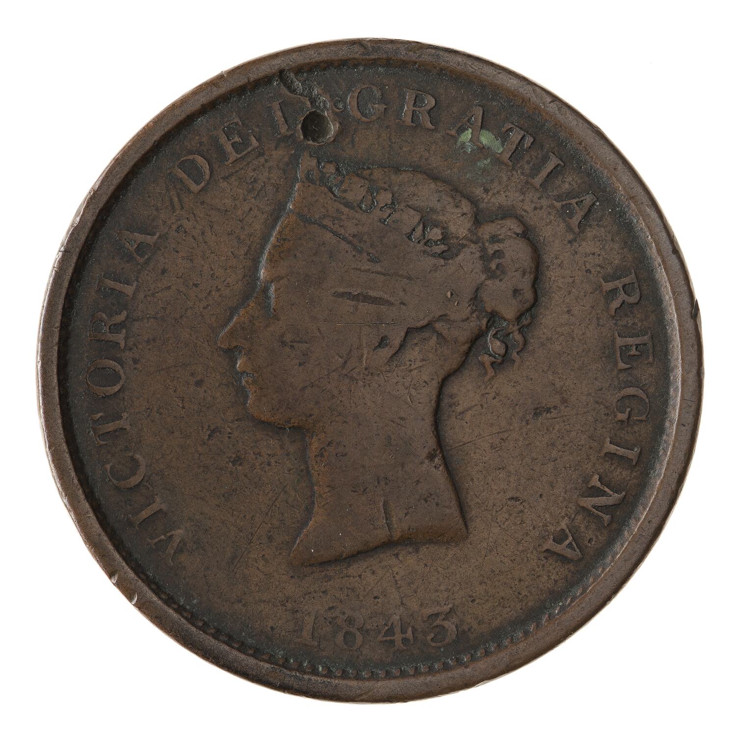 Coroneted head of the Queen facing left; around, VICTORIA DEI GRATIA REGINA; below, 1843