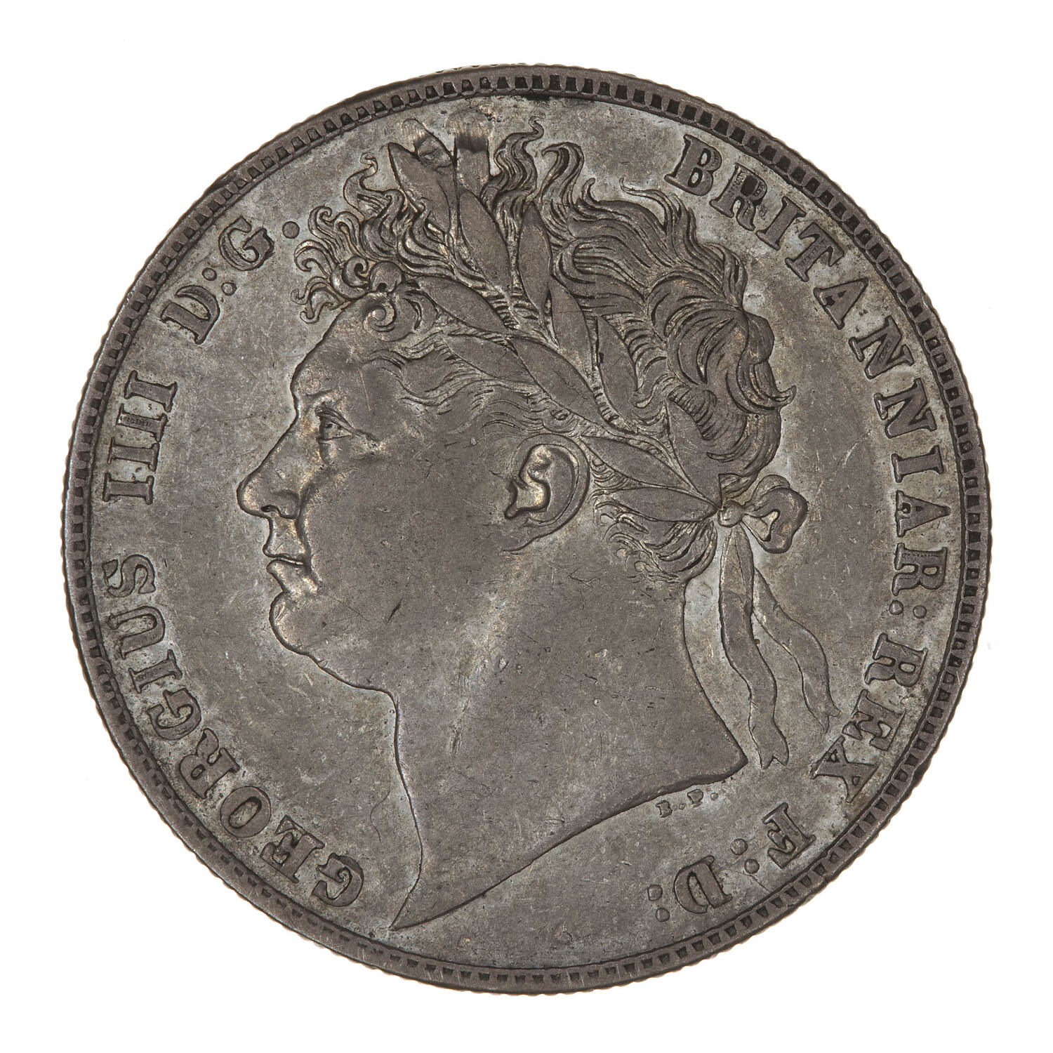 Laureate head of the King facing left; below in small lettering the artist's initials, B.P. (Benedetto Pistrucci); around, GEORGIUS IIII D: G: BRITANNIAR: REX F:D: