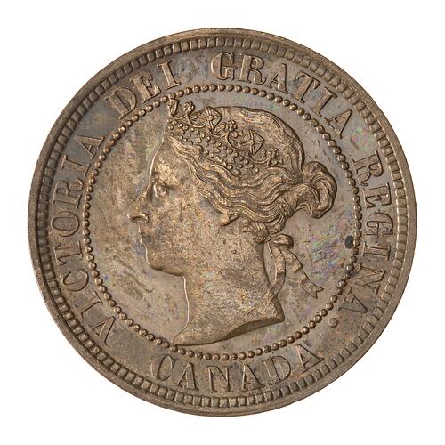 Within a beaded circle, head of the Queen facing left wearing coronet; around, VICTORIA DEI GRATIA REGINA; below, CANADA