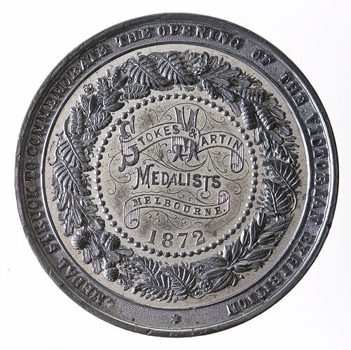 A white metal commemorative medal (48 mm. diameter). Around the edge on a broad rim is the legend MEDAL STRUCK TO COMMEMORATE THE OPENING OF THE VICTORIAN EXHIBITION. At the centre within a wreath is STOKES AND MARTIN MEDALISTS MELBOURNE 1872. On the reverse, a classical female figure representing the Colony of Victoria extending a victory wreath. Around her are the symbols of trade, industry and agriculture, the basis of Victoria's wealth. Below this in small letters is the maker's name STOKES AND MARTIN MELBOURNE.