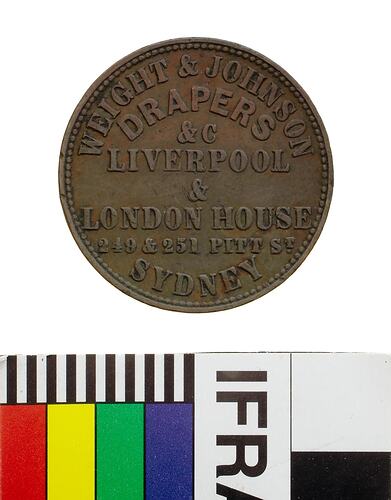 Copper Halfpenny Token, minted by Heaton & Son, Birmingham. Issued by Weight & Johnson, Drapers & Outfitters, Sydney, circa 1857. J.W. Weight & James Johnson, drapers, are listed in two Sydney Directories (Sand's Directories for 1857-1858 and 1861-1862). Over the period 1851-1870, John Weight was the only draper of that surname listed in Sydney directories, other than this four-year interlude where J.W. Weight is listed as a principal of Weight & Johnston.