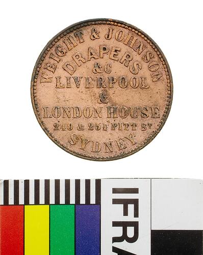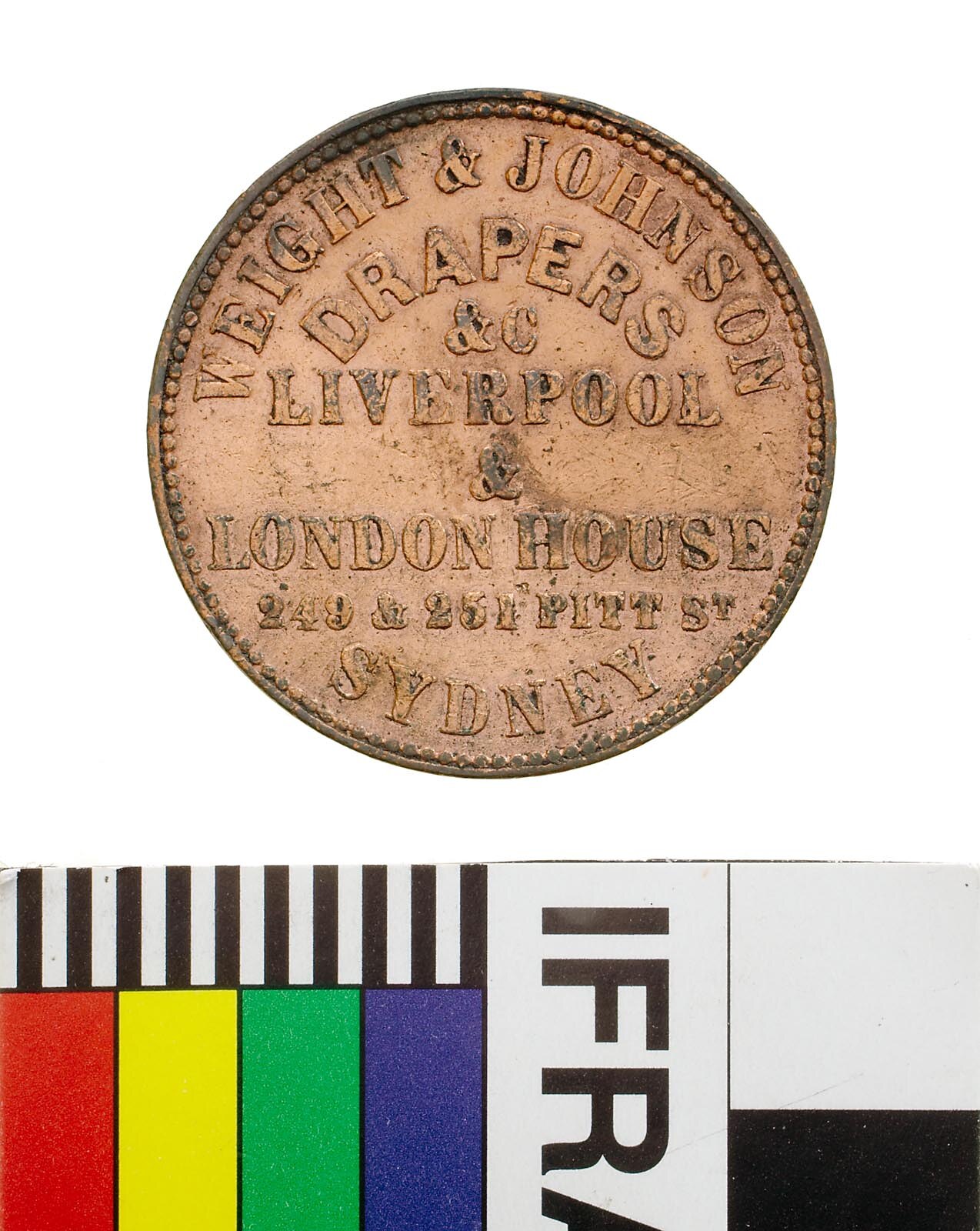 Copper Halfpenny Token, minted by Heaton & Son, Birmingham. Issued by Weight & Johnson, Drapers & Outfitters, Sydney, circa 1857. J.W. Weight & James Johnson, drapers, are listed in two Sydney Directories (Sand's Directories for 1857-1858 and 1861-1862). Over the period 1851-1870, John Weight was the only draper of that surname listed in Sydney directories, other than this four-year interlude where J.W. Weight is listed as a principal of Weight & Johnston.