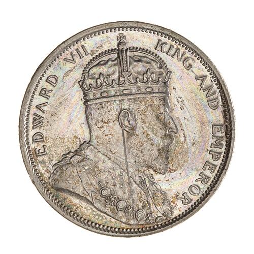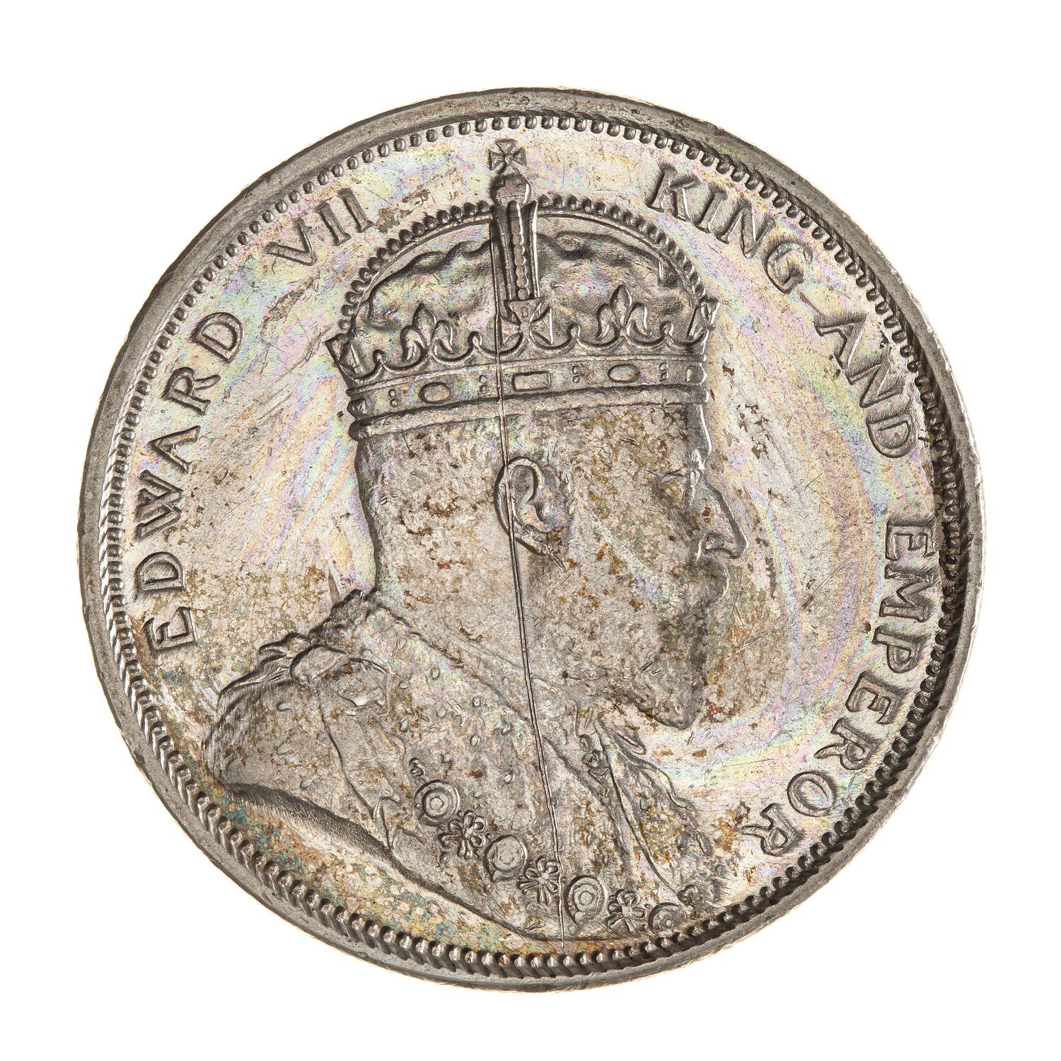 Bust of the King wearing the Imperial crown and an ermine Robe of State with the Collar of the Most Honourable Order of the Bath; around, EDWARD VII KING AND EMPEROR; the artist's initials DES below bust (the mint mark, B, incuse on cross of crown)