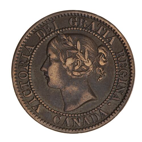 Within a beaded circle, laureate head of the Queen, with plait of hair falling below the ear, facing left; around, VICTORIA DEI GRATIA REGINA; below, CANADA