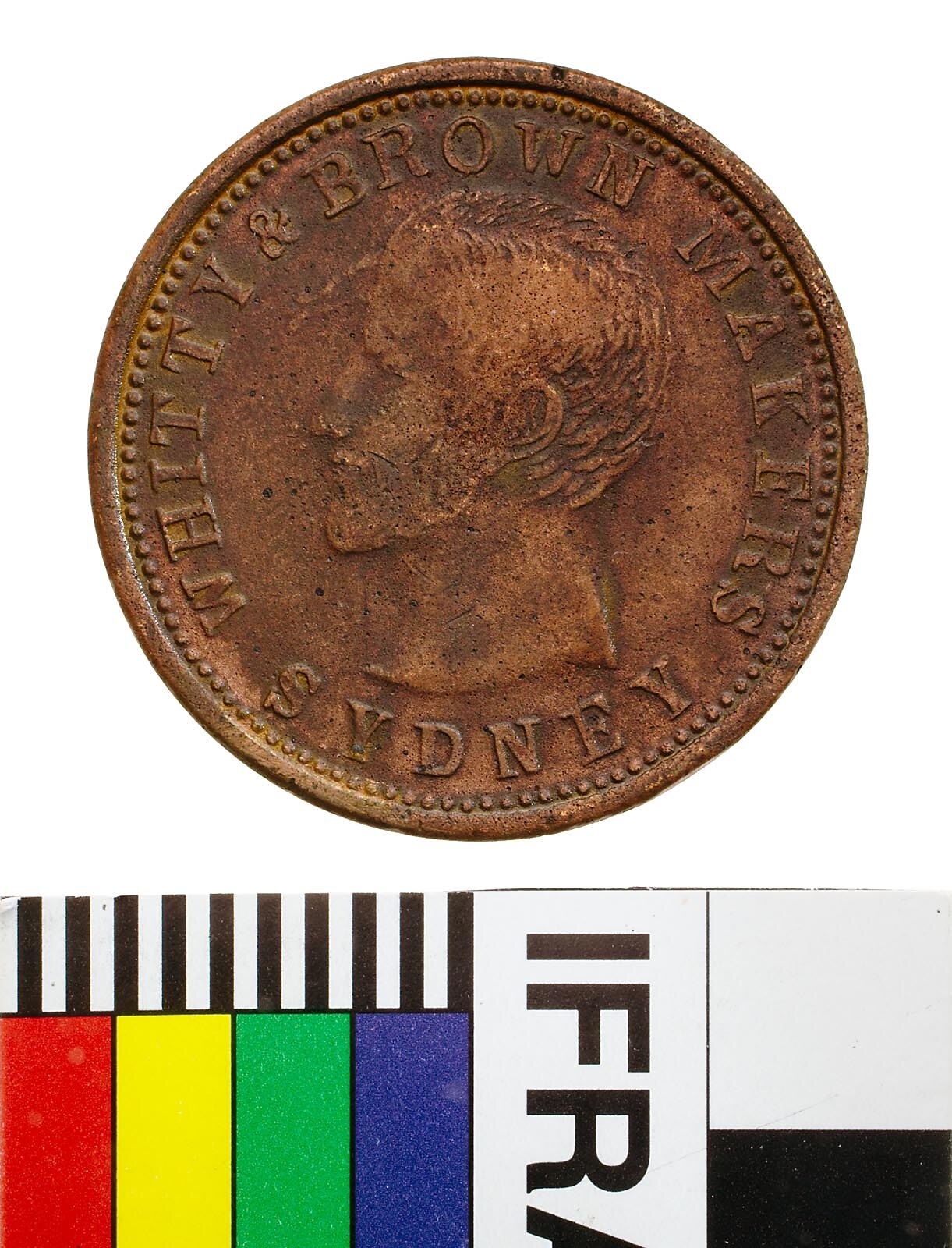 Head of man facing to left (some die deterioration in field from forehead); around, WHITTY & BROWN MAKERS; below, SYDNEY