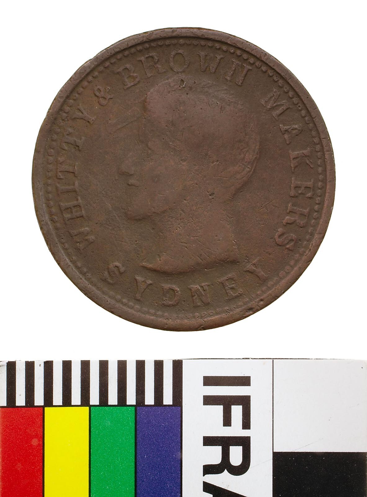 Head of man facing to left (some die deterioration in field from forehead); around, WHITTY & BROWN MAKERS; below, SYDNEY