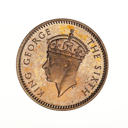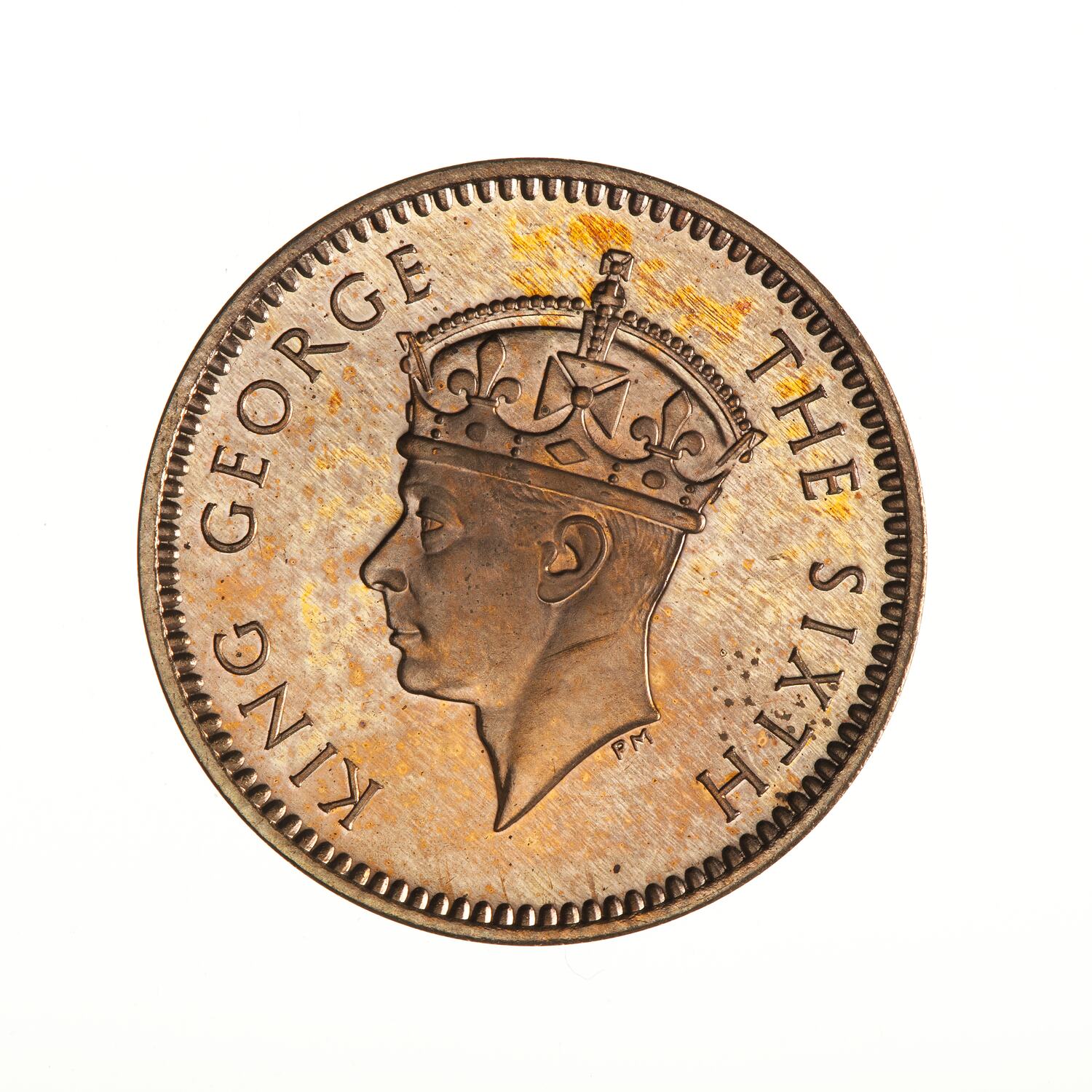 In 1925, Mr. Kruger Gray prepared new reverse designs effecting improvements in the form of the numerals and letters of the Mauritius coins. These versions were used for the punches supplied in 1942 to the Pretoria Mint, where Mauritius coins were produced during the war. But this was the first occasion on which they were used for coins produced at the Royal Mint.'
