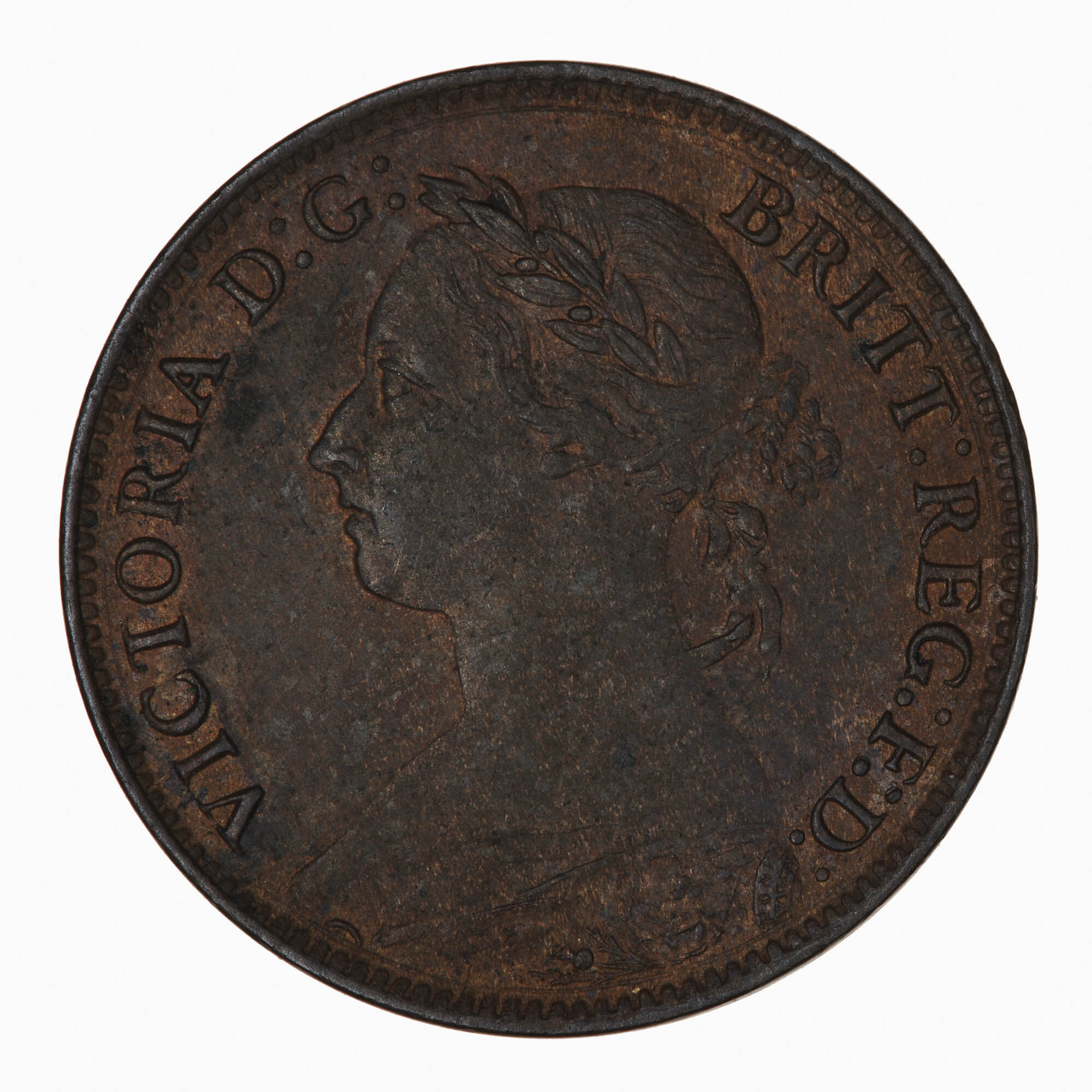 A farthing is a quarter penny. The bronze farthing replaced the earlier and larger copper farthing in 1860. This coin was current in all Australian colonies.