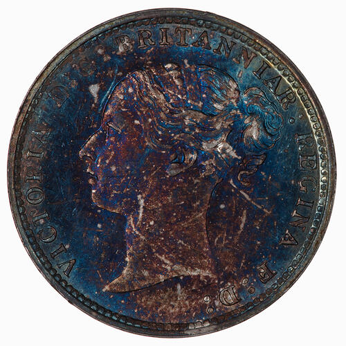 Head of the Queen facing left, wearing ribbon in hair; around, VICTORIA D:G: BRITANNIAR: REGINA F:D: