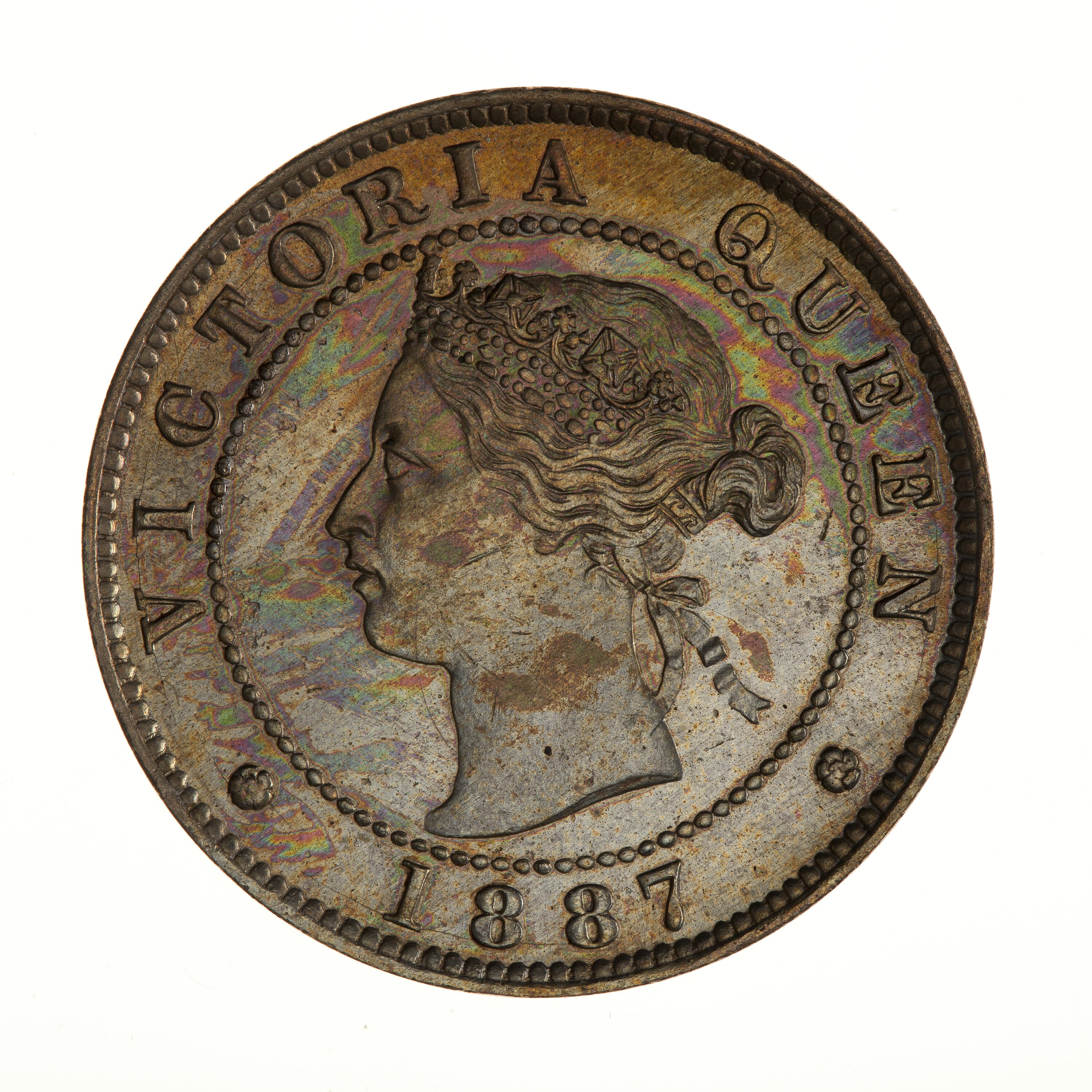 Within a beaded circle, a diademed head of the Queen facing left; around, VICTORIA QUEEN; below between two roses, 1887
