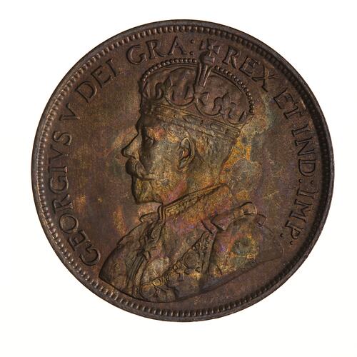 Crowned bust of the King facing left; around, GEORGIVS V DEI GRA: REX ET IND: IMP:; on bust truncation in small letters the artist's initials, B.M.