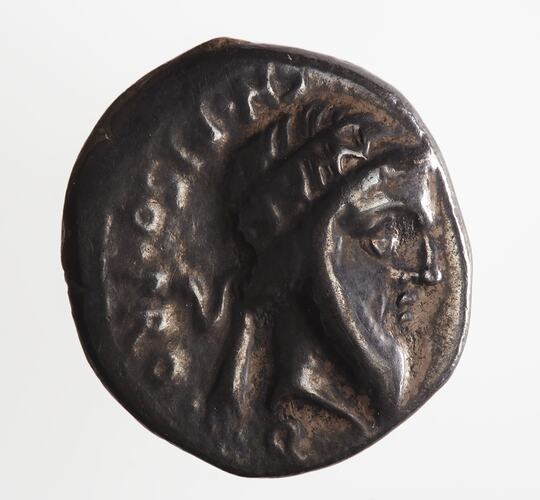 Diademed head of Numa facing right; behind, CN. PISO. PRO. Q; off flan at right, [PISO]