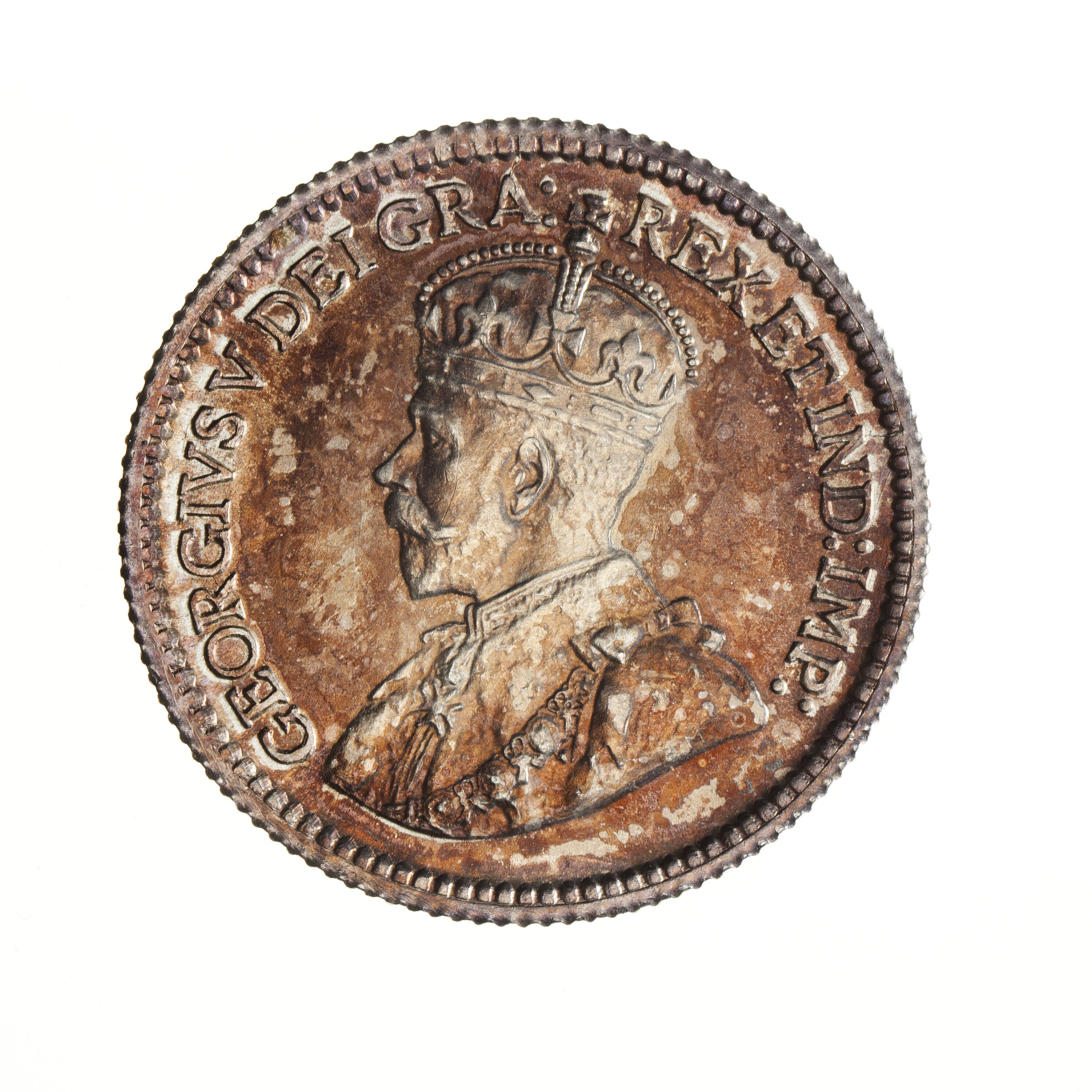 Crowned and draped bust of the King facing left; around, GEORGIVS V DEI GRA: REX ET IND: IMP:; artist's initials, B.M., on bust truncation