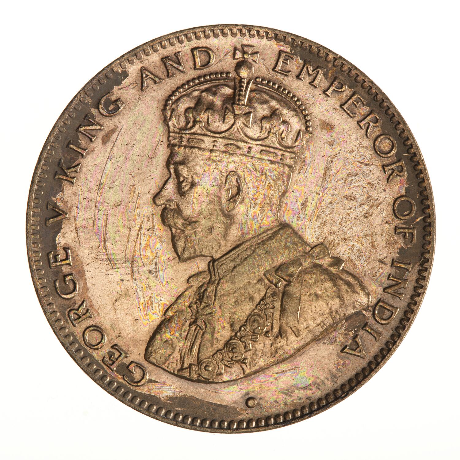 Crowned and draped bust of the King facing left, the King is wearing the Imperial Crown and the ermine Robe of State, the Collar of the Most Noble Order of the Garter, and the Badge of the Most Honourable Order of the Bath; around, GEORGE V KING AND EMPEROR OF INDIA; on bust truncation, the artist's initials, BM