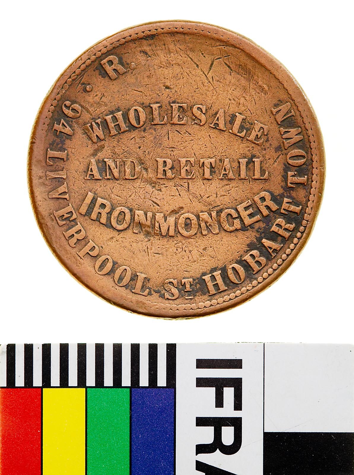 Legend in five lines with first and last curved around the rim: R. HENRY / WHOLESALE / AND RETAIL l IRONMONGER / 96 LIVERPOOL ST. HOBART TOWN