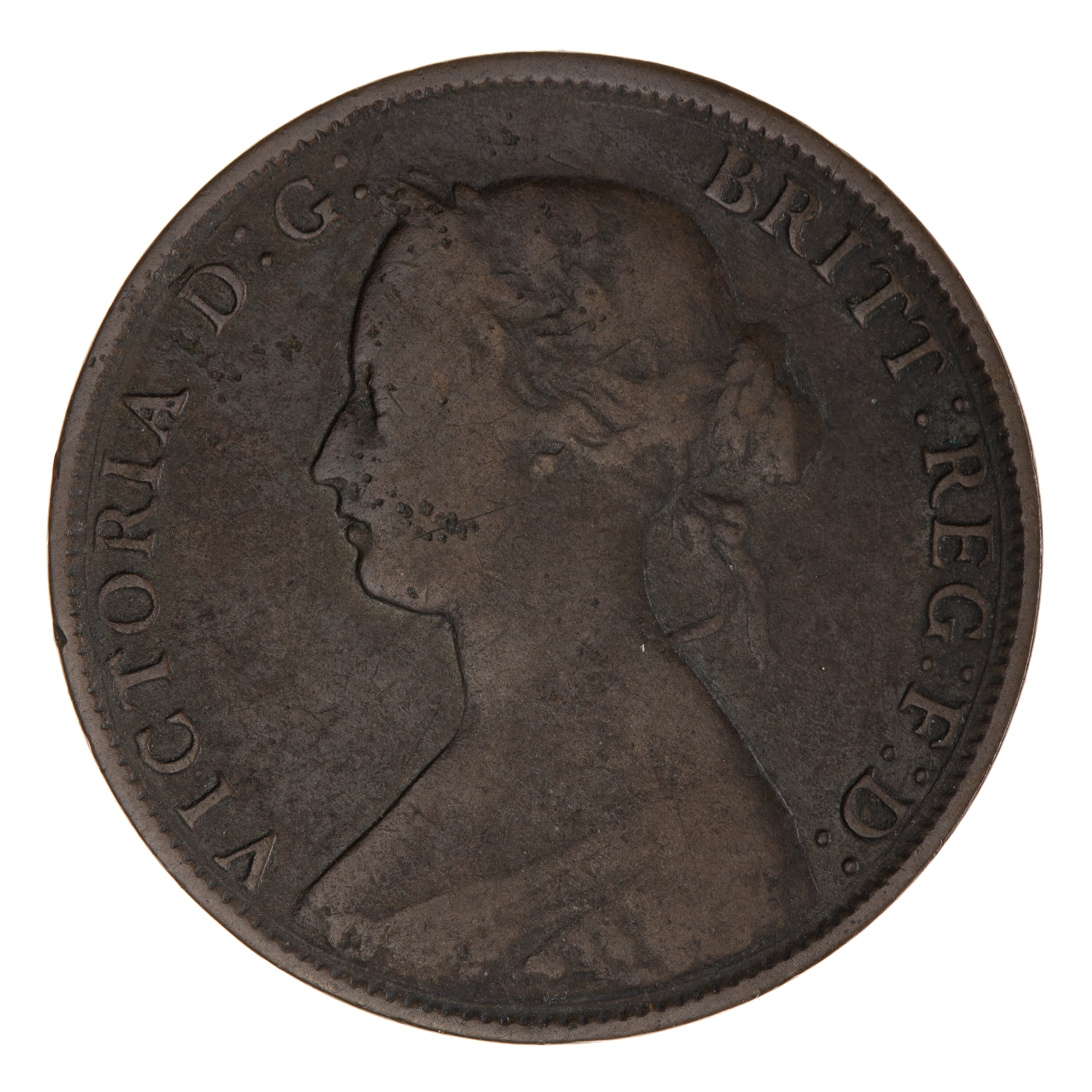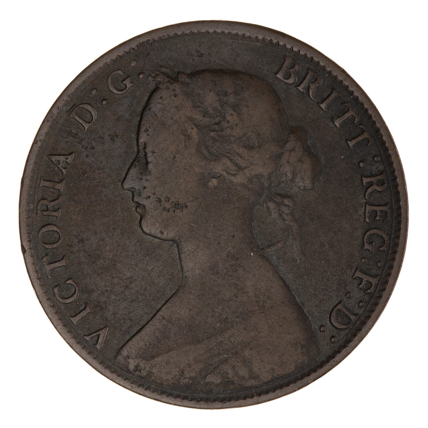 Laureate bust of the Queen facing left; around, VICTORIA D:G: BRIT: REG: F:D: