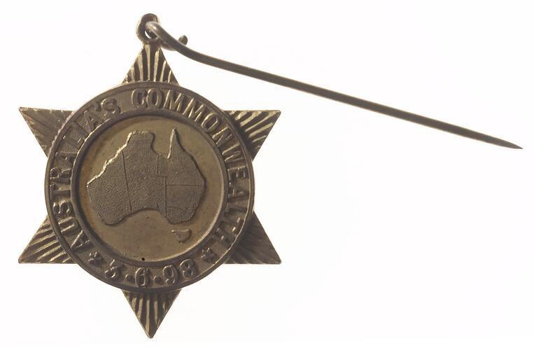 Map of Australia, within ring; on ring, AUSTRALIA'S COMMONWEALTH * 3-6-98 *; from the ring a series of rays form the six points of a star the top one of which has a loop with attached pin for wearing. The map of Australia is divided into the six colonies / states with each ray representing one.