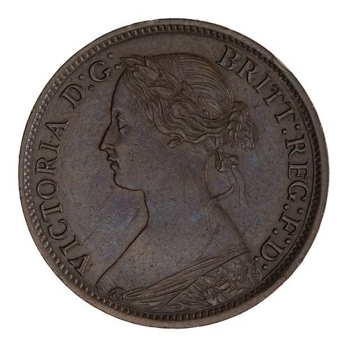 Laureate bust of the Queen facing left; around, VICTORIA D:G: BRIT: REG: F:D: