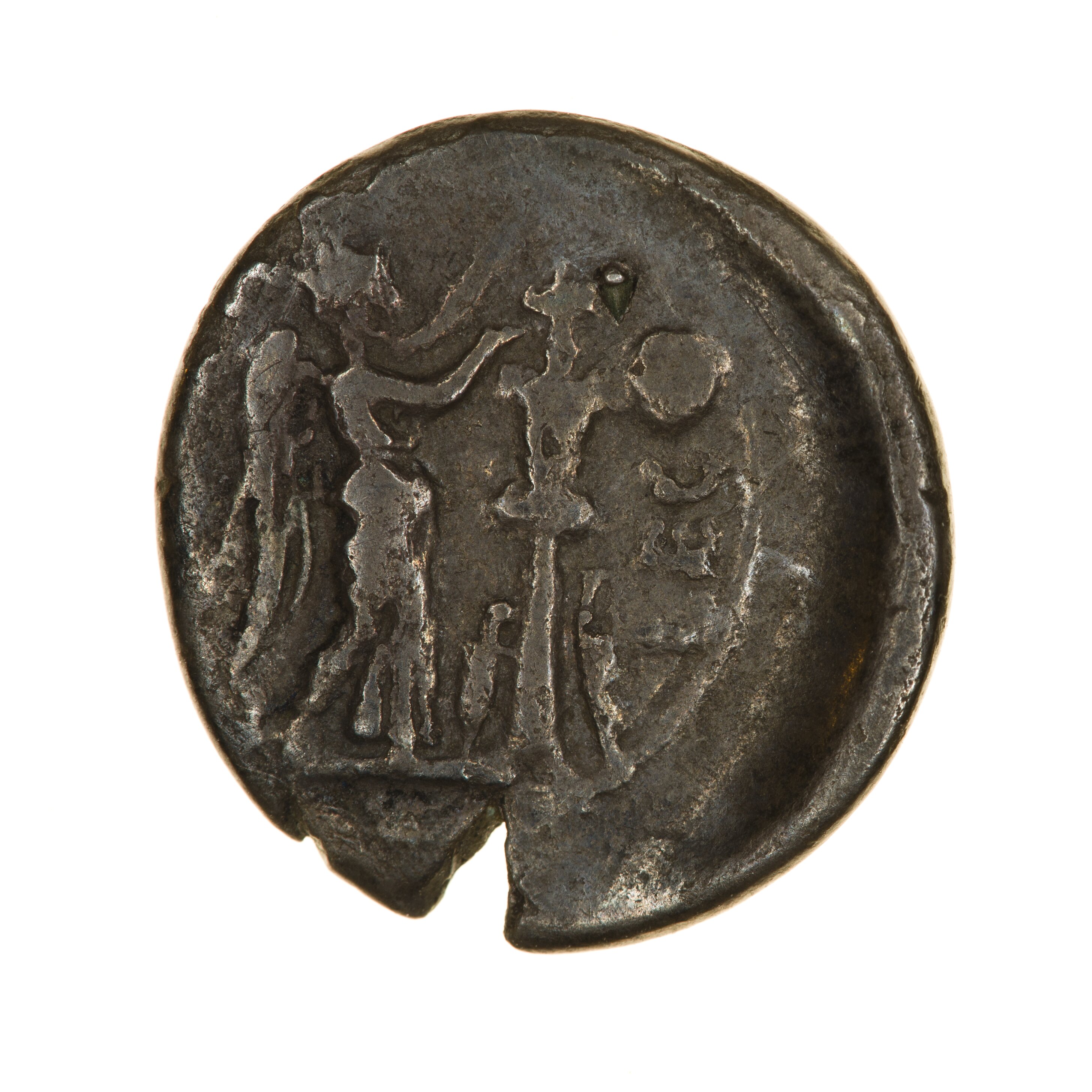 Victory standing facing right crowning a trophy, a dagger and sword at it's base; around [P CARISI] LEG