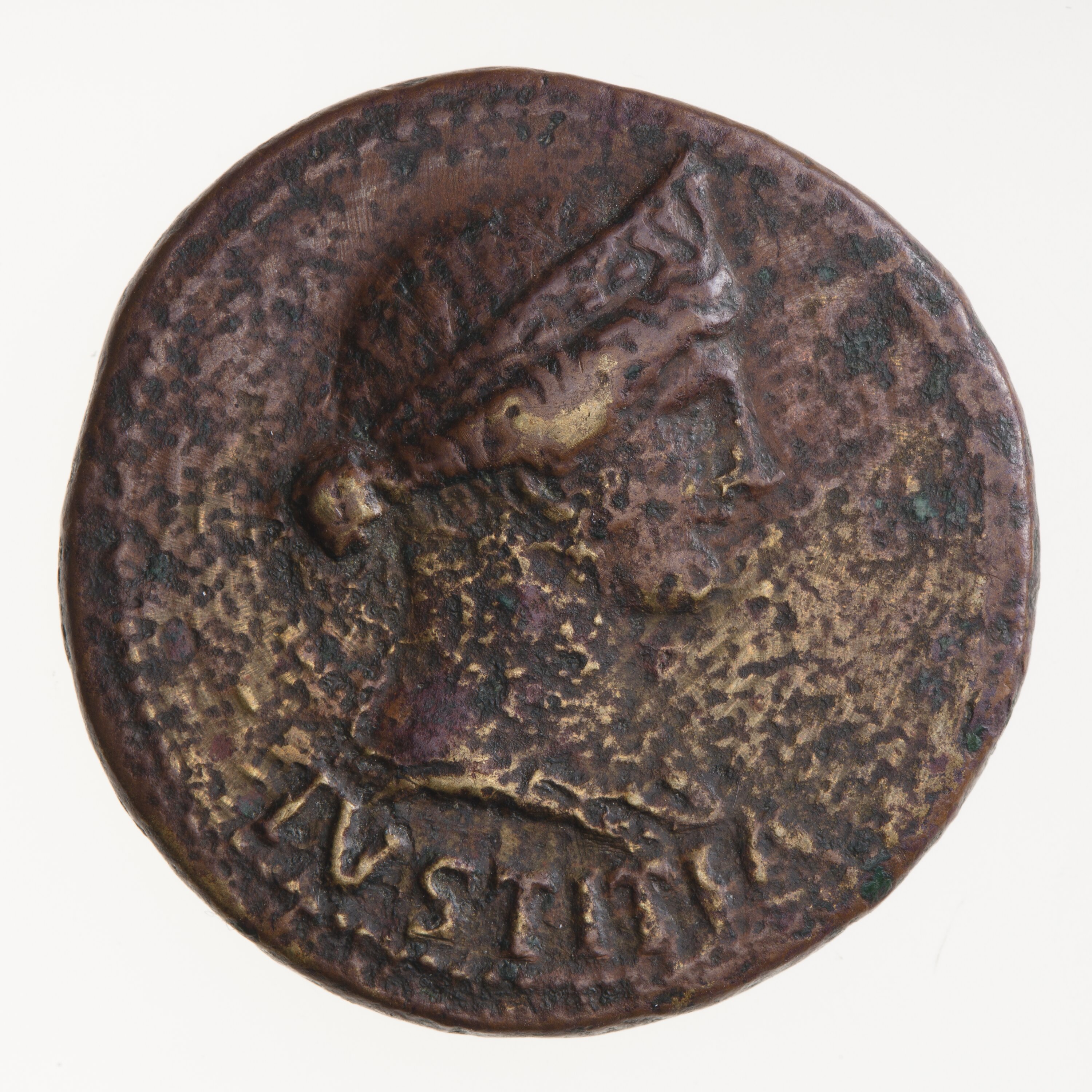 Orichalcum Dupondius of Tiberius struck during his 24th year of holding the Tribunitian power (21-22 AD). Minted by Rome, Ancient Roman Empire. When this coin was struck the Rome mint was responsible for the production of most Imperial copper and bronze coinage, although at this early stage of the Empire many regional base metal coinages were being struck for local use. Precious-metal coins were then being struck at Lugdunum in Gaul. The portrait on the obverse of this coin is widely held to be of Livia Drusilla, mother of Tiberius although Sutherland describes it as simply Justitia as it is named on the coin.