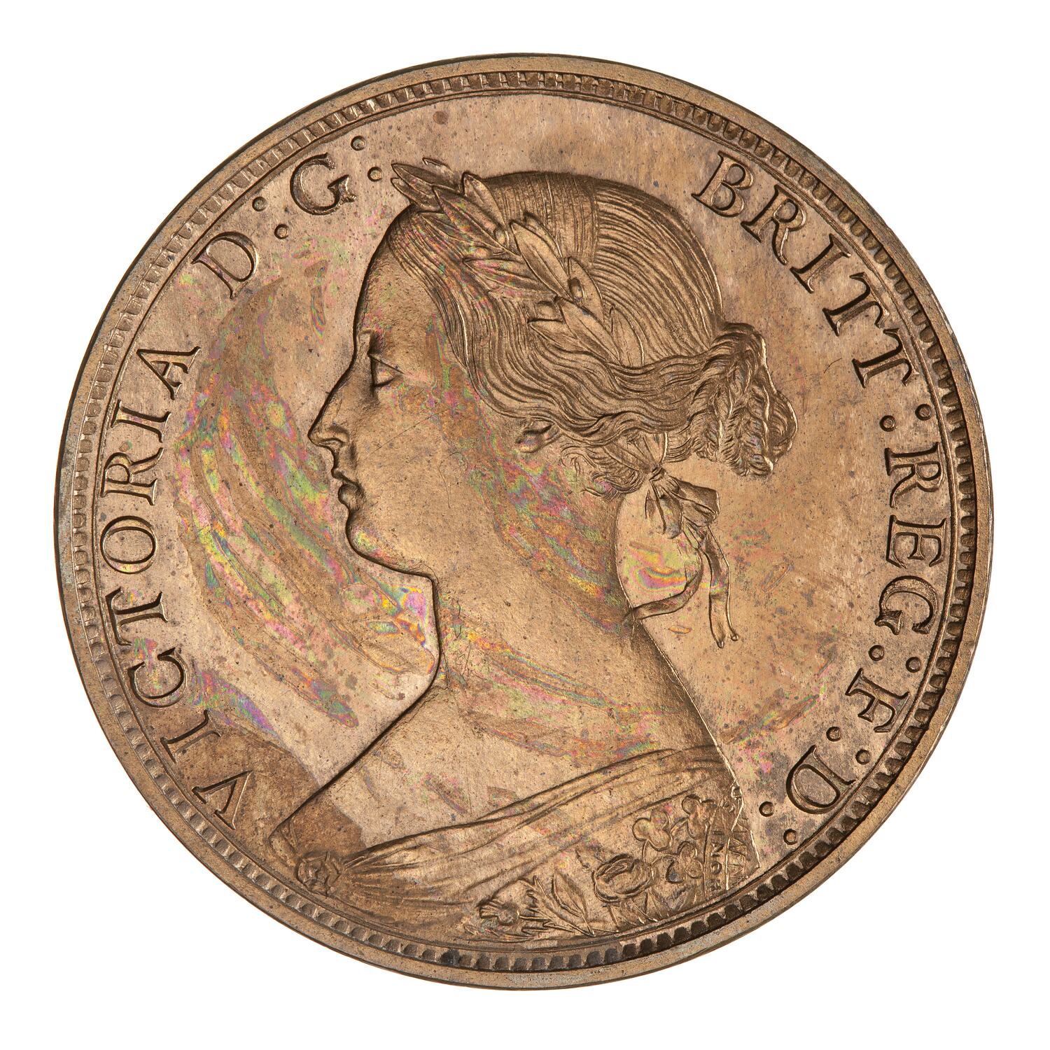 Laureate bust of the Queen facing left; around, VICTORIA D:G: BRIT: REG: F:D:
