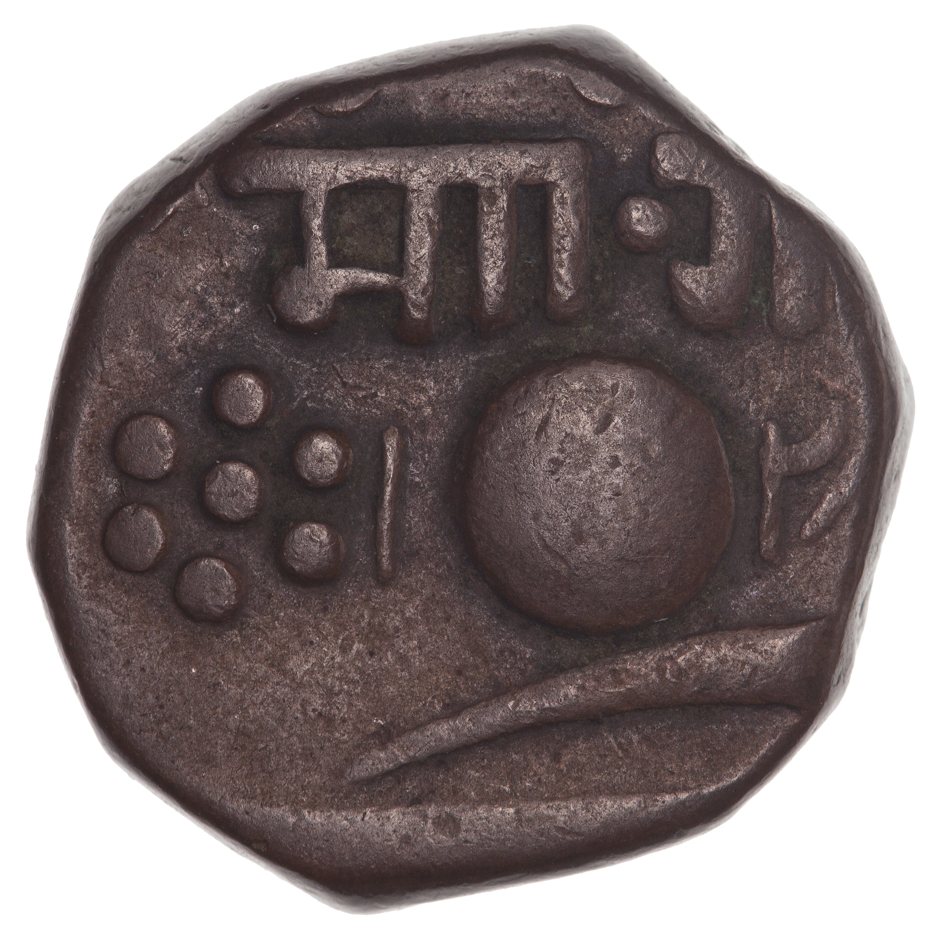 Struck off-centre, circle with Negari legend above, blade of scimitar and hint of Persian legend below; plus three numerals of date, 1 to left and 28 to right of circle are present