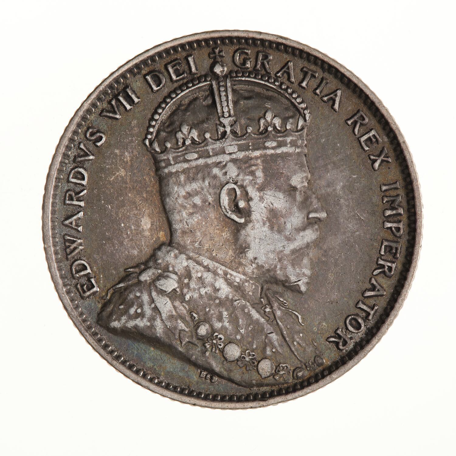 Crowned bust of the King facing right; around, EDWARDVS VII D.G. REX IMPERATOR; below bust in small letters the artist's initials, DES