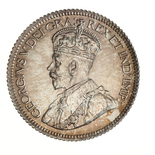 Crowned and draped bust of the King facing left; around, GEORGIVS V DEI GRA: REX ET IND: IMP:; artist's initials, B.M., on bust truncation