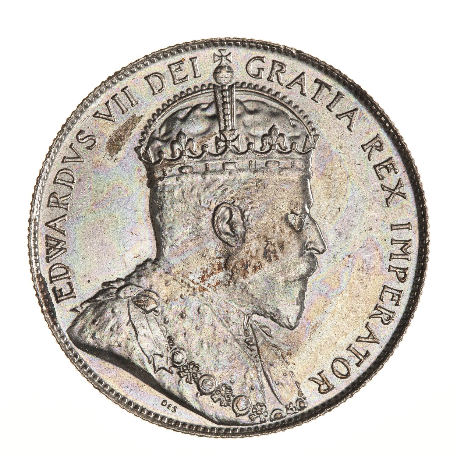 Crowned bust of the King facing right; around, EDWARDVS VII D.G. REX IMPERATOR; below bust in small letters the artist's initials, DES