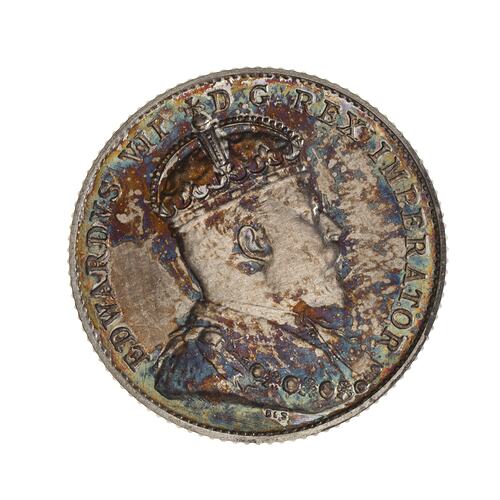 Crowned bust of the King facing right; around, EDWARDVS VII D.G. REX IMPERATOR; below bust in small letters the artist's initials, DES