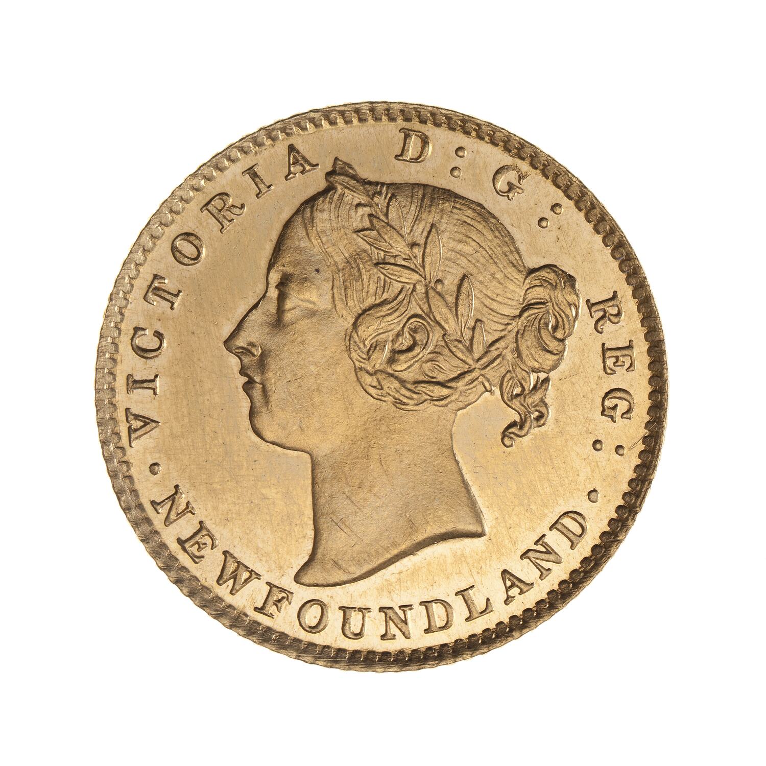 Laureate head of the Queen, with plait of hair falling below the ear, facing left; around below, . NEWFOUNDLAND .; around above, VICTORIA D: G: REG: