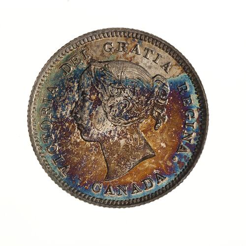 Laureate head of the Queen facing left; around, VICTORIA DEI GRATIA REGINA; below, CANADA