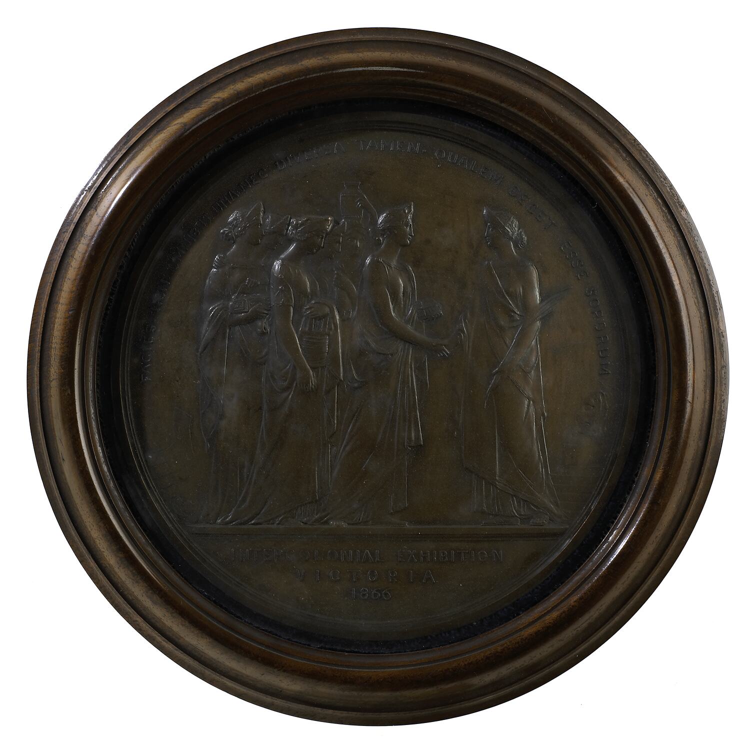 Other Details: 648 medallions were produced to be awarded to exhibits of excellence at the Intercolonial Exhibition and an additional 50 for special merit. This medal is sealed in a domed glass covered, circular cedar frame. The medal itself is standard bronze finish like the issued pieces, but the lettering is primative suggesting an early artist's model and the date 1866 rather than the 1866-67 eventually used. The simply finished exergue legend reads INTERCOLONIAL EXHIBITION / VICTORIA / 1866. The prize medals as eventually adopted had this in a single line curved around below a space where the winners name was stamped or commissioners details engraved.. A second example of this form, gilt and mounted in a rectangular picture frame is also held. (Both were listed by Chitty in 1920 neither with acquisition details). The Intercolonial Exhibition of Australasia was held on the site of the Public Library, in new wings that eventually became the site of the Industrial and Technology Museum in 1870, a forerunner to the National Museum of Victoria. The Exhibition covered 56,240 ft. The majority of the 2,956 exhibitors were Victorian, but the other Australian states also contributed significantly; displays were also mounted by exhibitors from New Zealand, New Caledonia, Netherlands-India and Mauritius. The Exhibition opened on 24 October 1866 closed on 23 February 1867. A total of 268,634 people attended.