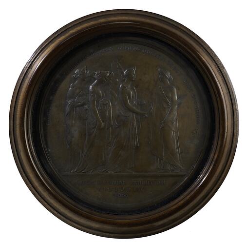 Inside a circular cedar frame with convex glass cover the bronze medal features on the right, the personification of Victoria, standing facing left and holding palm in left hand while receiving her "six sisters" who each bring a contribution; Behind Victoria is a Lion's head perhaps representing one of the lions that flanked the Museum (where the Exhibition was held). Behind the 'six sisters' an ancient ship's prow. Around above, hand engraved, the Latin FACIES NON OMNIBUS UNA NEC DIVERSA TAMEN QUALEM DECET ESSE SORORUM [translates as: "They all look different and yet alike : as sisters would"]. The exergue legend reads in three lines INTERCOLONIAL EXHIBITION / VICTORIA / 1866. The frame is of simpler form than the type eventually used for the issued medals of the exhibition. The artist's and manufacturers names are not included on this trial but do occur on the issued medals.