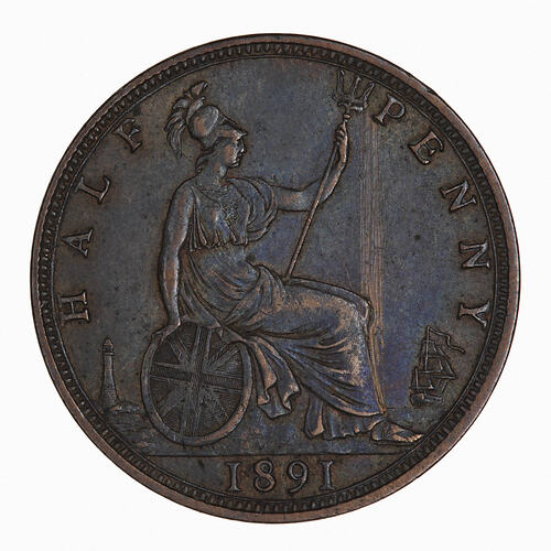 Britannia seated facing right on a rock wearing a helmet and breastplate with flowing dress; she holds a trident and rests her right hand on a shield which bears the combined crosses of the Union Flag; at right a ship sailing away; at left, a lighthouse; around, HALF PENNY; in exergue, 1893