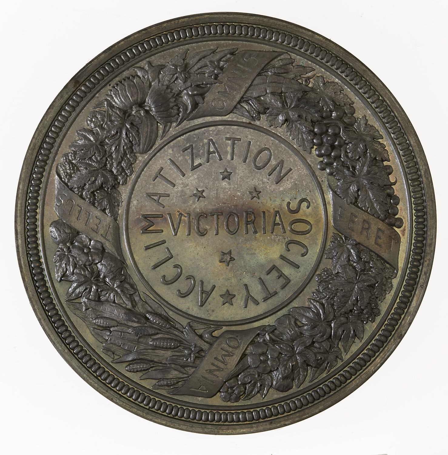 Obverse: ACCLIMATIZATION SOCIETY VICTORIA OMNIA TELLUS OMNES FERET Reverse: J.S. & A.B. WYON SC. 1868 T. LANSEER A.B.A. ADJ.