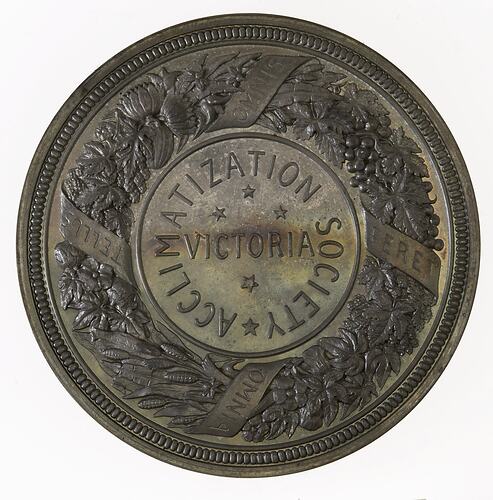 At centre, across four stars of the Southern Cross, VICTORIA; around, ACCLIMATIZATION SOCIETY * around the centre a wreath of imported plants (including graoe vines and wheat) bound with ribbon inscribed, OMNIA TELLUS OMNES FERET