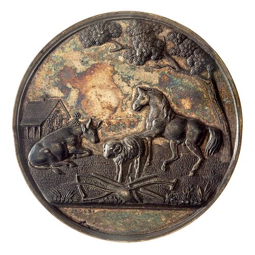 A silver prize medal (51 mm. diameter) featuring a rural scene of farm house, reclining cow, sheep, horse and tools below gum tree branch; in exergue in tiny letters, ARNOLDI and details of the prize engraved within open wreath below small kangaroo.