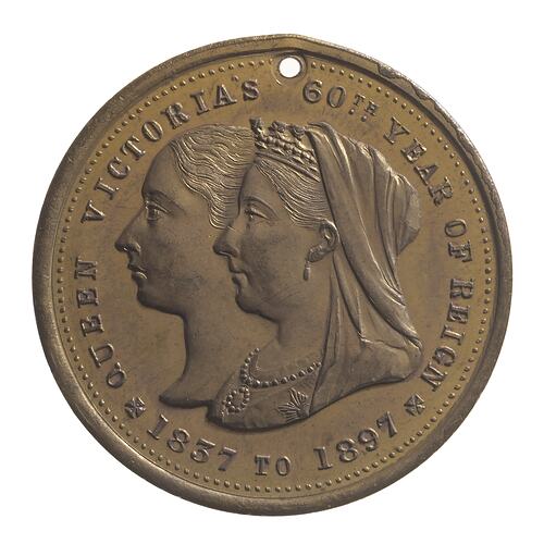 Jugate busts, young & old Queen Victoria; around, QUEEN VICTORIA'S 60TH YEAR OF REIGN * 1837 TO 1897 * (stops on either side of date in form of crosses).