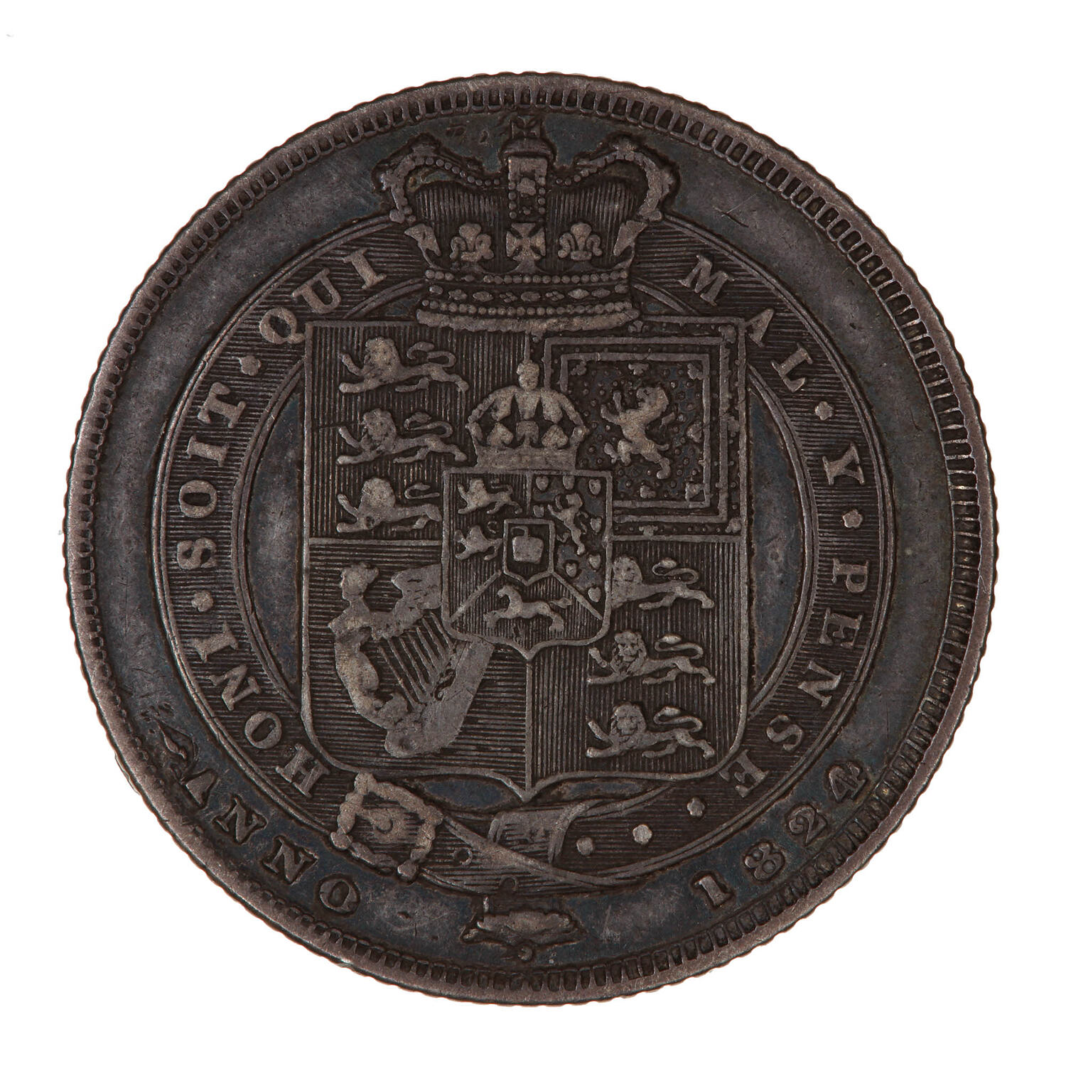 Within the Garter with motto, HONI SOIT QUI MAL Y PENSE, a crowned square shield bearing the royal arms; around below, ANNO 1824