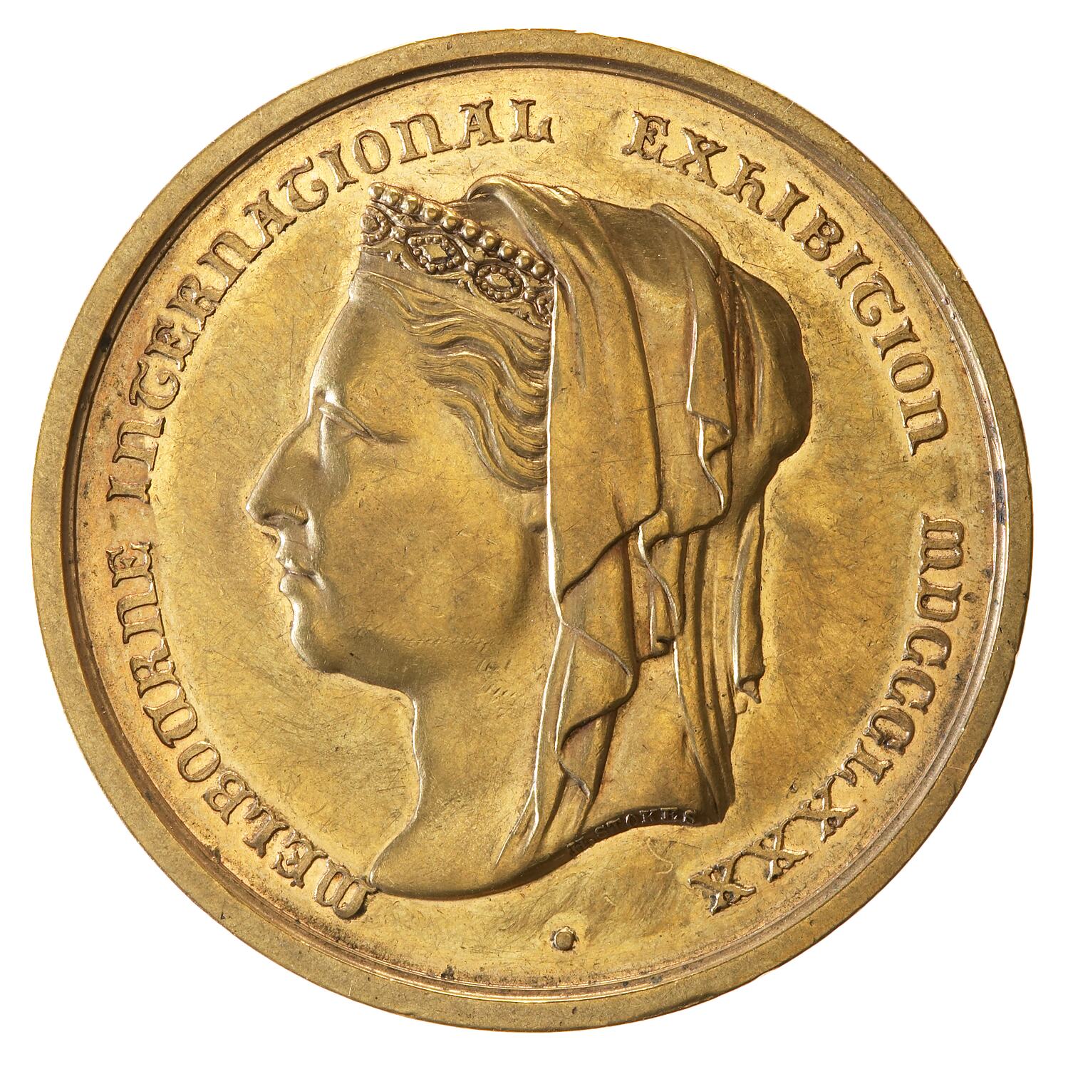 Veiled head of Queen Victoria left; around, MELBOURNE INTERNATIONAL EXHIBITION MDCCCLXXX .