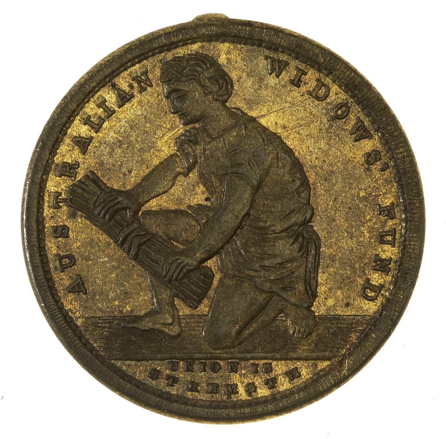 A woman facing left, kneeling on her left knee trying unsuccessfully to bend (or break) a tied bundle of thin branches on her right knee; around above, AUSTRALIAN WIDOWS FUND in exergue, UNITY IS STRENGTH