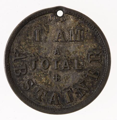 The medal is inscribed with the statement "I am a Total Abstainer" on the obverse, with the Lord's prayer on the reverse.