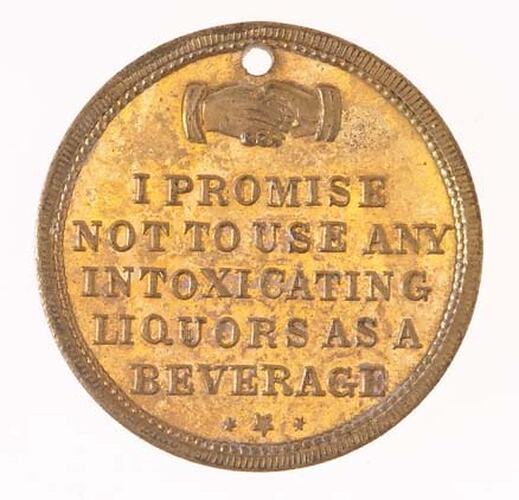 A gilt medal (19 mm diameter and holed to be worn) stating that the wearer promises to abstain and featuring the Lord's Prayer. Obverse shows two clasped hands; reverse is an inscription of the Lord's Prayer.