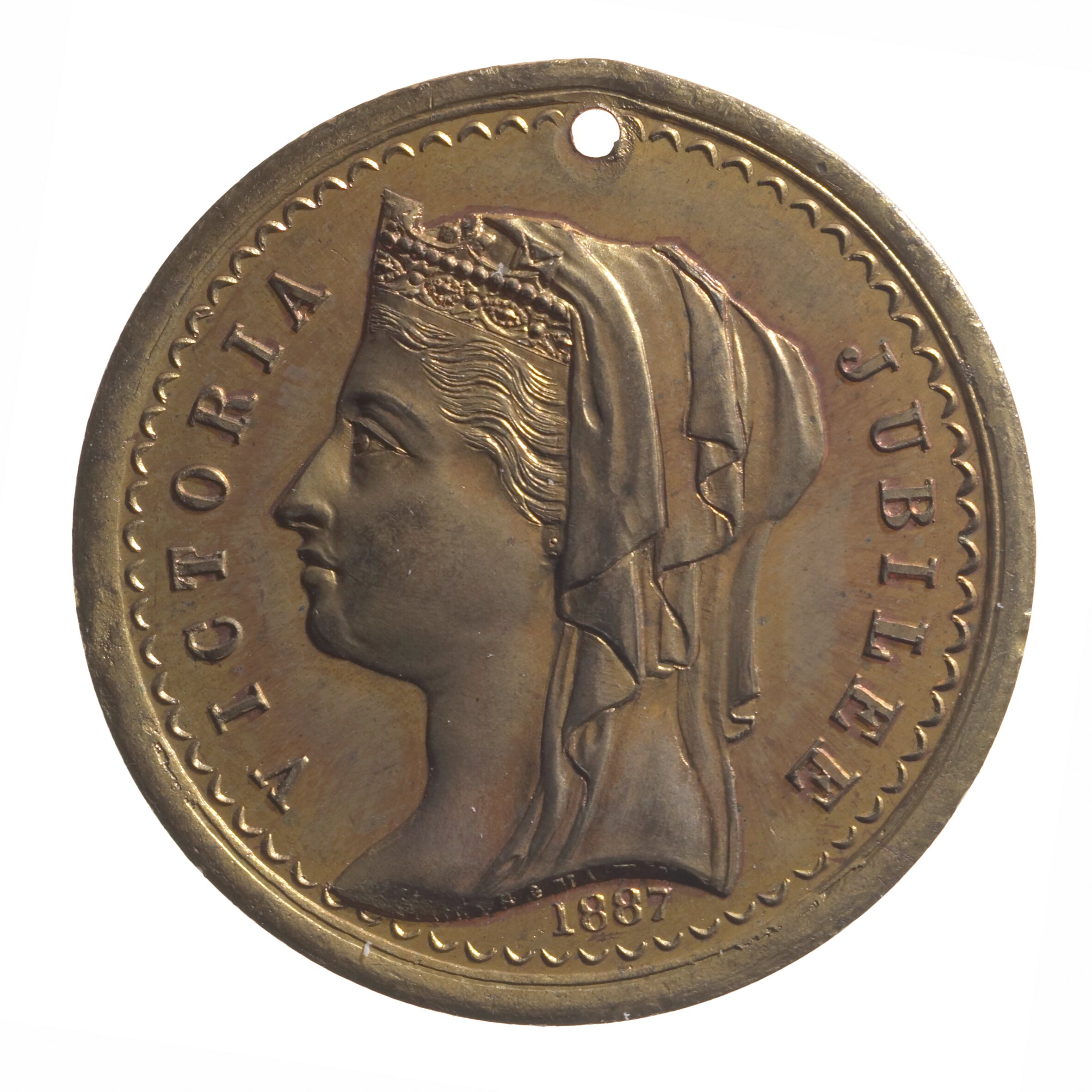 Head of Queen Victoria facing left, wearing veil and coronet; Around, VICTORIA'S JUBILEE Below, 1887. Inscription on truncation of Queen's neck: H.S.