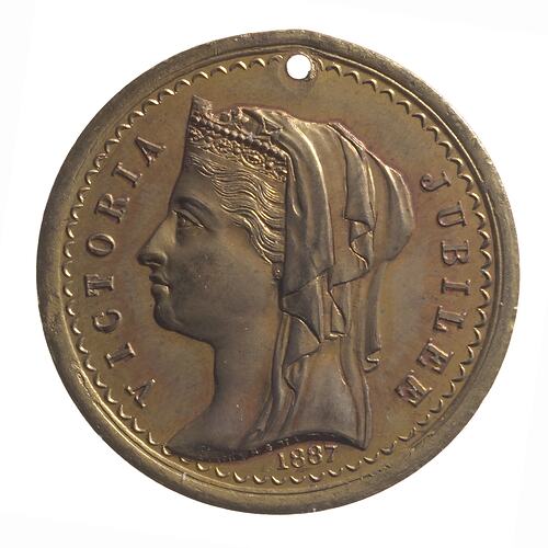 Other Details: Medal issued in 1887 by the Town of Portland to celebrate the 50th jubilee of Queen Victoria's ascension to the throne. It names W.T. Pile as Mayor. William Thomas Pile served as Mayor from 1887 to 1888. Portland is regarded as the birthplace of Victoria. The Henty brothers, entrepreneur farmers and whalers, established the state's first permanent white settlement in Portland in 1834. It initially rivalled Melbourne, but developed slowly as a fishing port.