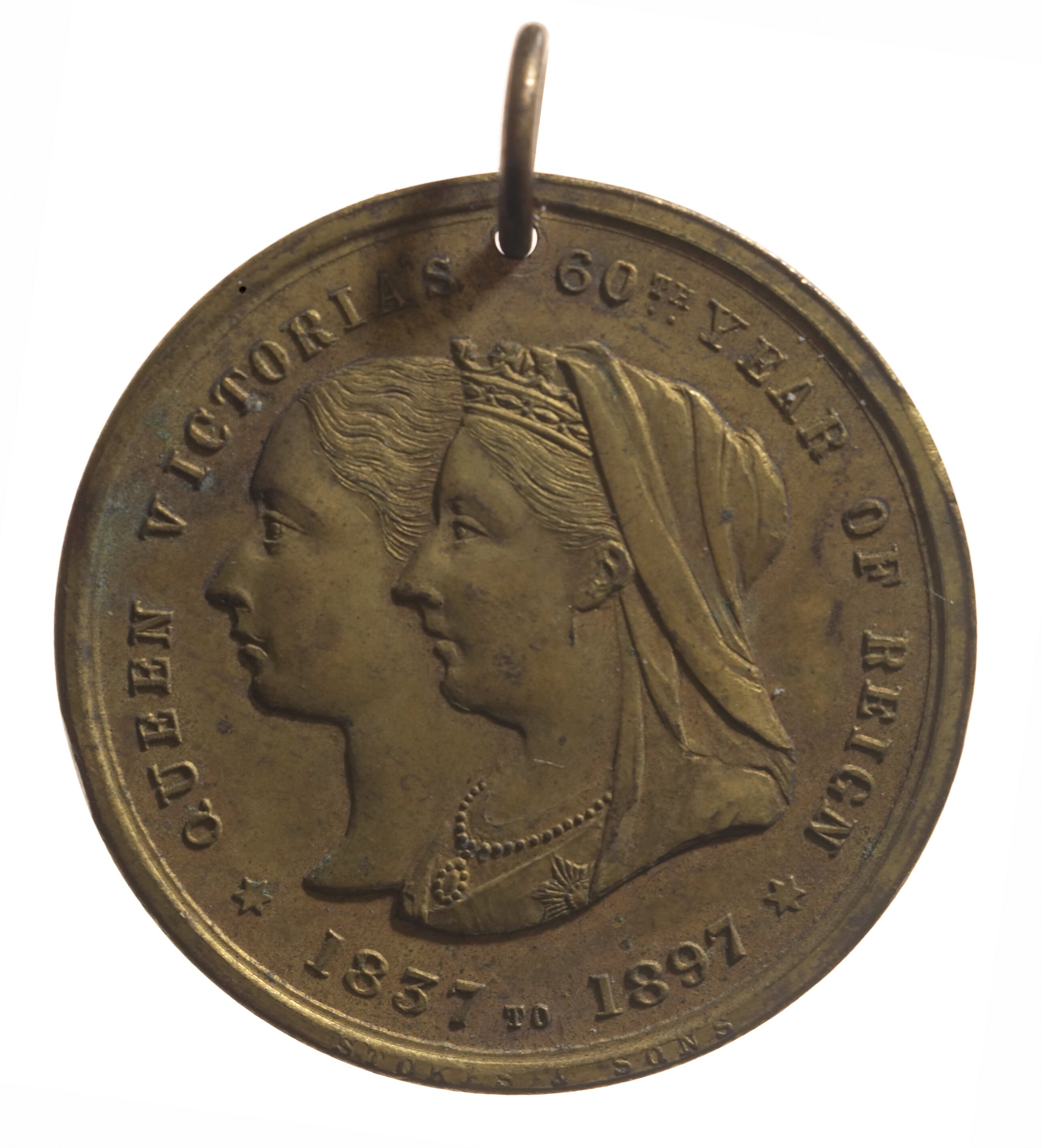 Conjoined young head and veiled bust of Queen Victoria left, around, QUEEN VICTORIA'S 60TH. YEAR OF REIGN * 1837 TO 1897 * On edge in tiny letters, STOKES & SONS